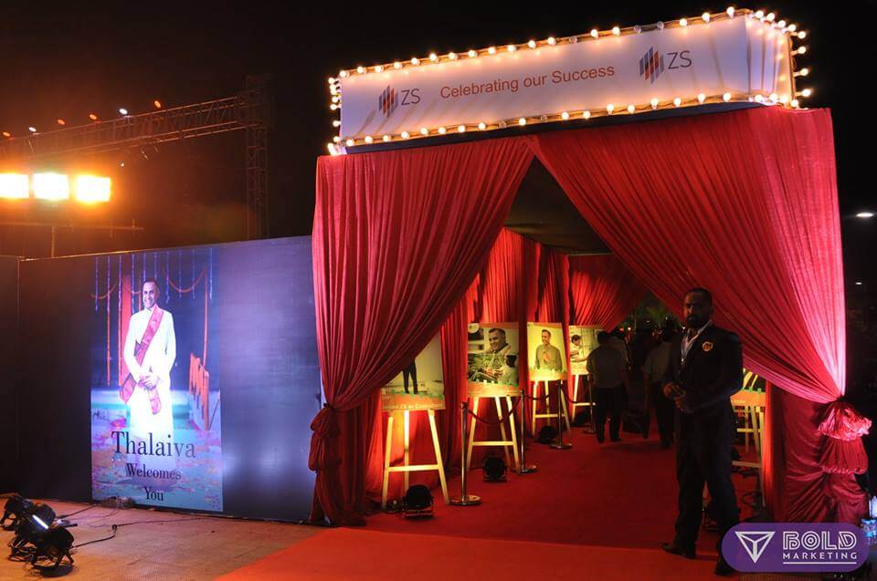 Project Description Our newest client ZS Associates, gave us the task of managing a very important event for them. The event was their current MDs farewell party. The color scheme was red and black and we added a slight “Red Carpet” element to the theme with our custom entry and walkway.